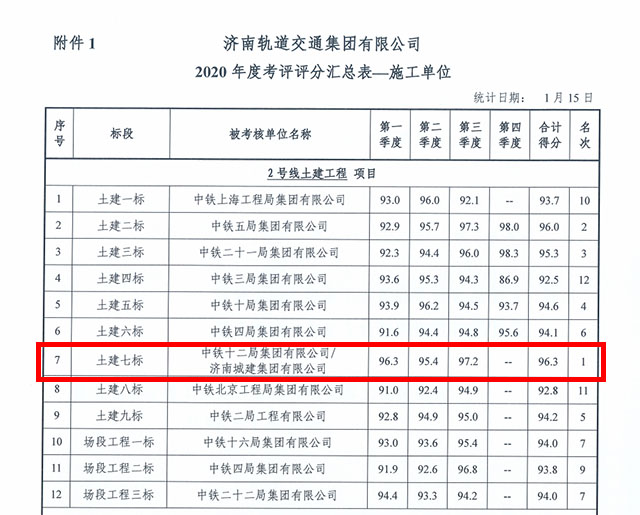 1月25日,軌道交通R2線(xiàn)7標段項目接到了濟南軌道交通集團發(fā)布的《關(guān)于2020年度考評結果的通報》,集團承建的濟南軌道交通R2線(xiàn)一期土建工程施工七標段項目榮獲2020年軌道交通土建項目參建單位年度排名第一的好成績(jì)。