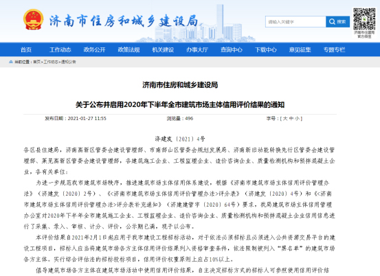2021年1月27日,濟南市住房和城鄉建設局組織的2020年下半年全市建筑市場(chǎng)主體信用評價(jià)結果公布,泉建公司以排名第一的好成績(jì)獲評AAA級檢測機構。