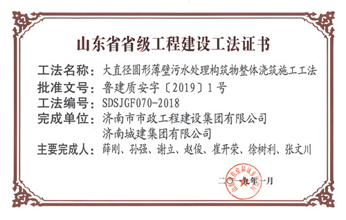 集團“大直徑圓形薄壁污水處理構筑物整體澆筑施工工法”被評為山東省省級工程建設工法