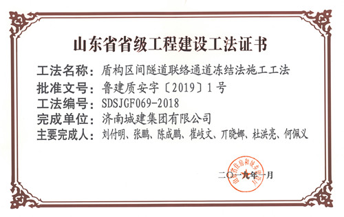 集團“盾構區間隧道聯(lián)絡(luò )通道凍結法施工工法”被評為山東省省級工程建設工法