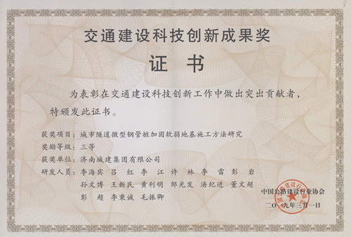 集團《城市隧道微型鋼管樁加固軟弱地基施工方法研究》榮獲“交通建設科技創(chuàng )新成果獎三等獎”