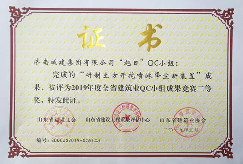 集團”旭日“QC小組完成的《研制土方開(kāi)挖噴漆降塵新裝置》成果被評為“2019年度全省建筑業(yè)QC小組成果競賽二等獎