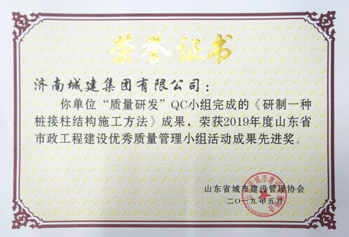 集團“質(zhì)量研發(fā)”QC小組完成的《研制一種樁柱結構施工方法》成果榮獲“2019年度山東省市政工程建設優(yōu)秀質(zhì)量管理小組活動(dòng)成果先進(jìn)獎