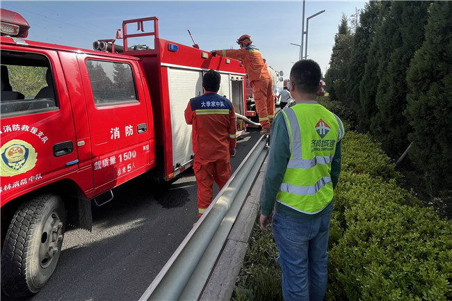 5月9日,一分公司煙臺濱海路項目部組織人員和設備馳援共建辦事處救火搶險。